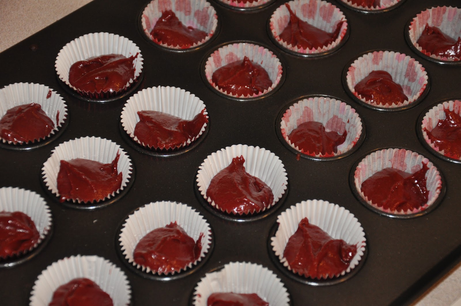 I assumed that the mistake was that I needed to put less batter in the pans. I thought they had simply overflowed, and that is what made them sink. So I mixed up more batter, siphoned a little off to bake separately, and put the rest into the pans. I stuck them in to bake and held my breath. I didn't open the oven, despite temptation, but waited like a Good Little Baker to see what happened. The timer went off. I took a deep breath, braced myself (suspenseful, right?), closed my eyes, and opened the oven door. No smell of smoke. Excellent. I peeked through one eye. Darn. I really had thought that I would have my gorgeous, spongy, perfectly smooth, slightly rounded red velvet cakes waiting for me there. Not so, my friends, I'm sorry to say. These ones had sunk too. Not nearly as badly, but they were still disappointing.